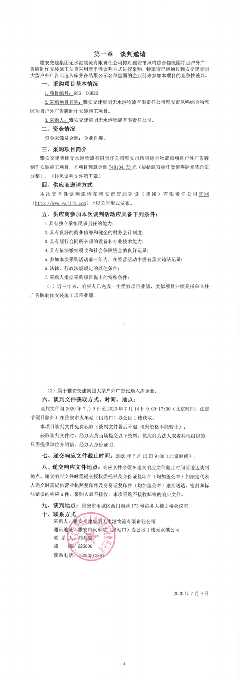 雅安交建集團(tuán)無水港物流有限責(zé)任公司雅安市鳳鳴綜合物流園項目戶外廣告牌制作安裝施工項目競爭性談判公告