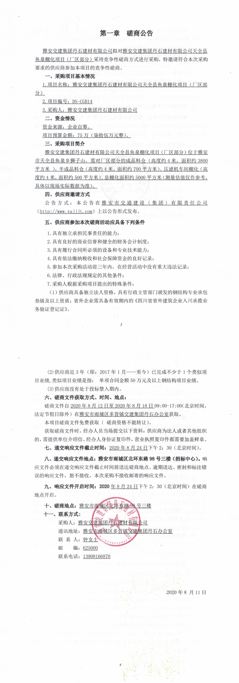 雅安交建集團(tuán)丹石建材有限公司天全縣魚(yú)泉棚化項(xiàng)目(廠區(qū)部分)競(jìng)爭(zhēng)性磋商公告