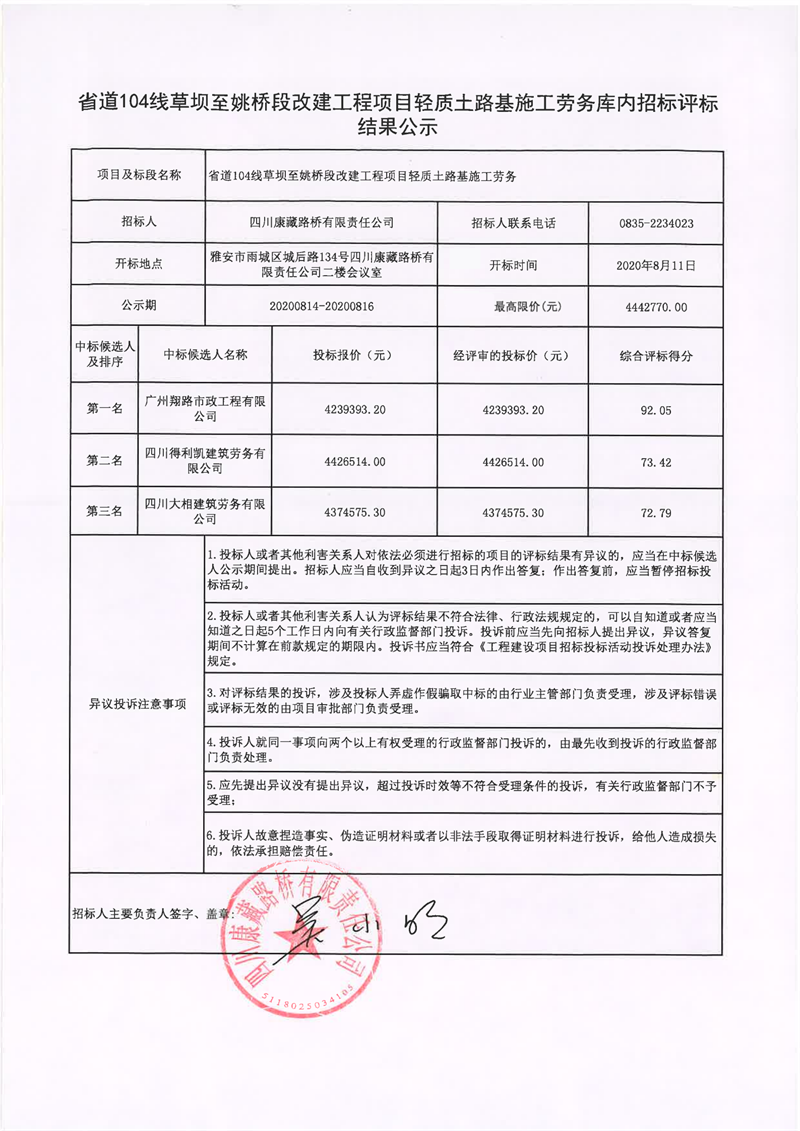 四川康藏路橋有限責任公司省道104線草壩至姚橋段改建工程項目輕質(zhì)土路基施工勞務(wù)庫內(nèi)招標評標結(jié)果公示