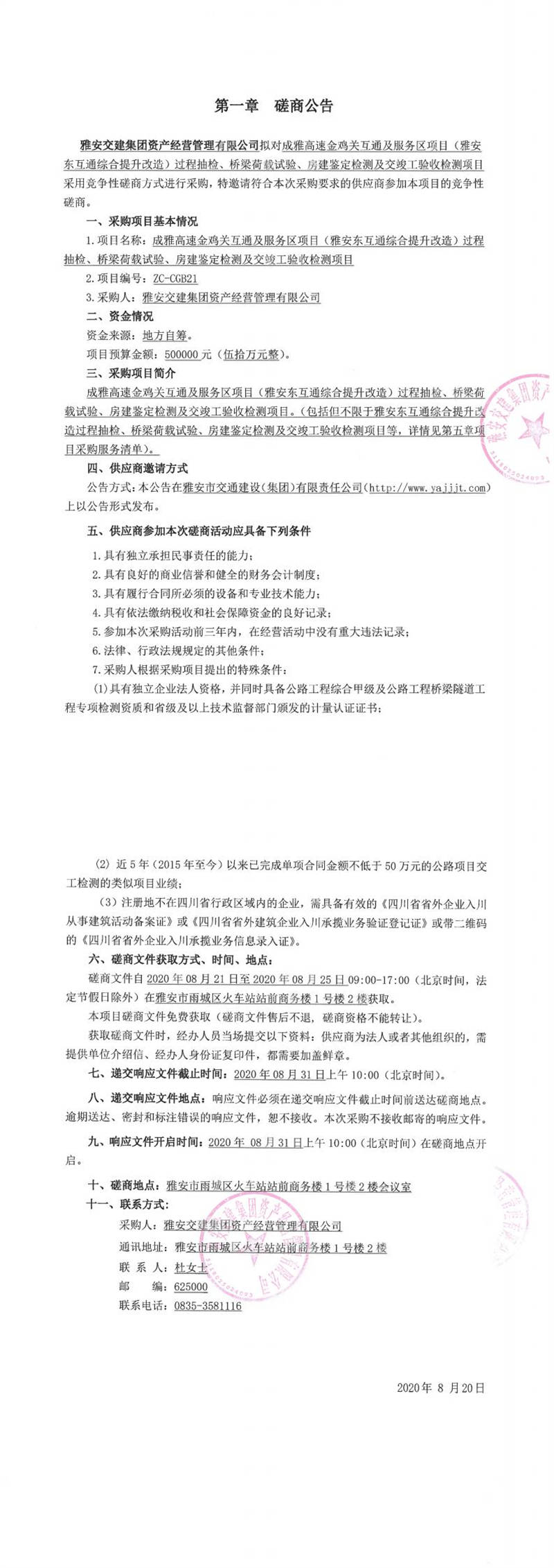 雅安交建集團(tuán)資產(chǎn)經(jīng)營管理有限公司成雅高速金雞關(guān)互通及服務(wù)區(qū)項目(雅安東互通綜合提升改造)過程抽檢、橋梁荷載試驗、房建鑒定檢測及交竣工驗收檢測項目磋商公告