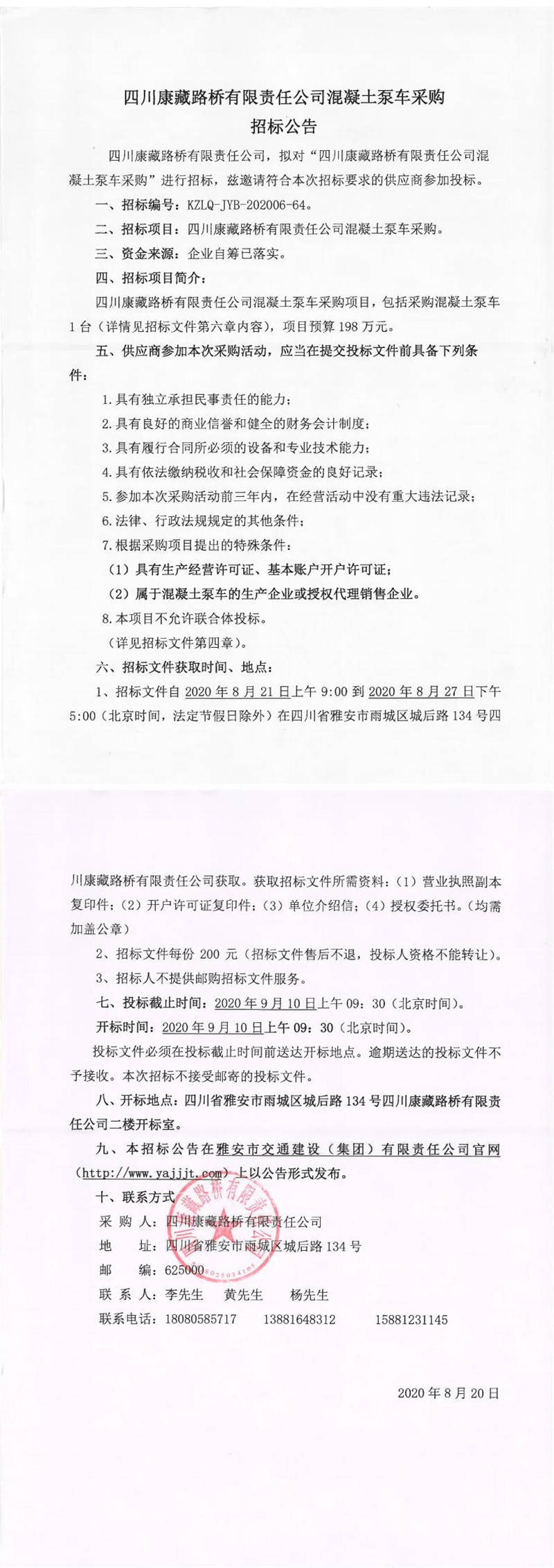 四川康藏路橋有限責(zé)任公司混凝土泵車采購(gòu)招標(biāo)公告