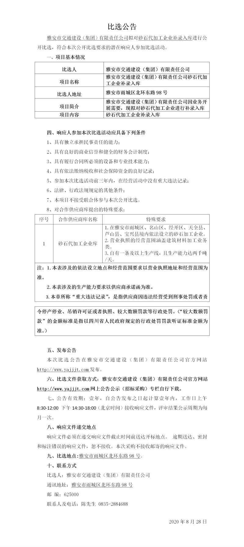 雅安市交通建設(shè)(集團(tuán))有限責(zé)任公司砂石代加工企業(yè)補(bǔ)錄入庫比選公告