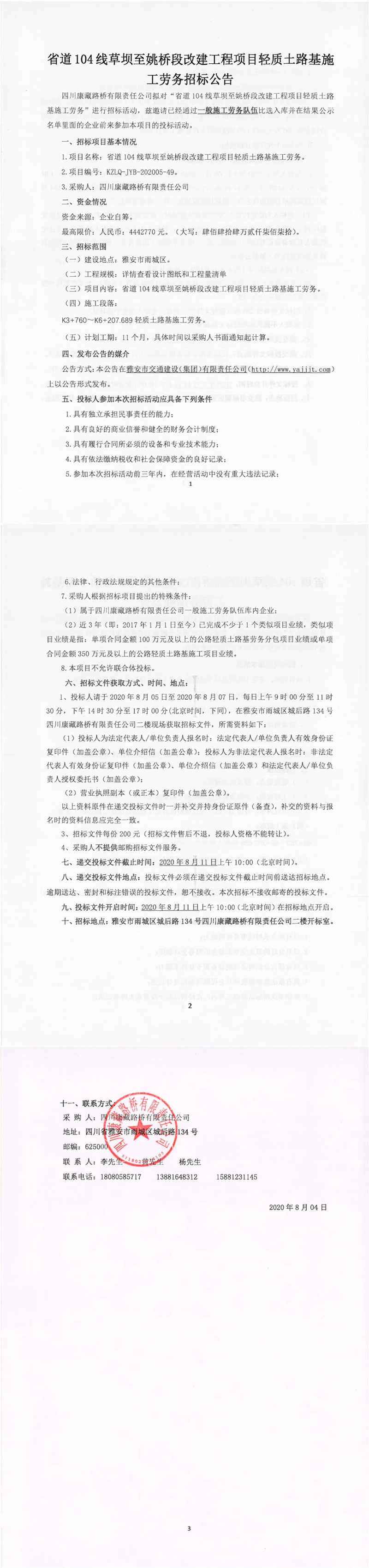 四川康藏路橋有限責(zé)任公司省道104線草壩至姚橋段改建工程項(xiàng)目輕質(zhì)土路基施工勞務(wù)招標(biāo)公告