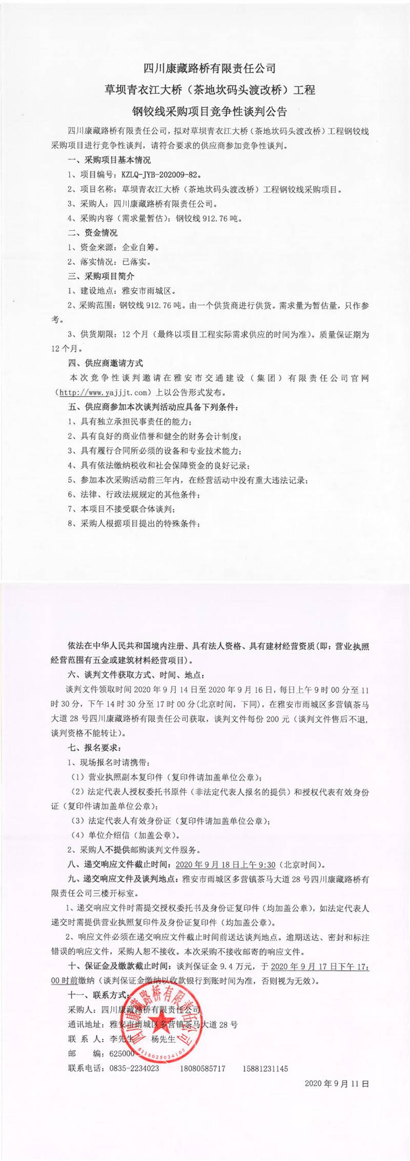 四川康藏路橋有限責(zé)任公司草壩青衣江大橋(茶地坎碼頭渡改橋)工程鋼鉸線采購項(xiàng)目競爭性談判公告