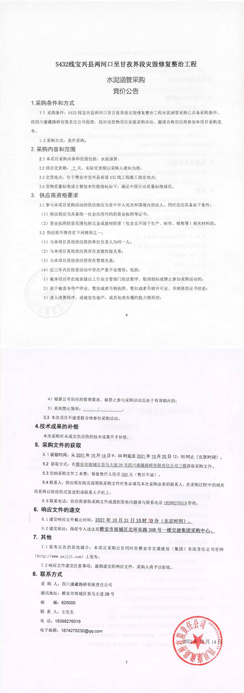 四川康藏路橋有限責(zé)任公司S432線寶興縣兩河口至甘孜界段災(zāi)毀修復(fù)整治工程水泥涵管采購(gòu)競(jìng)價(jià)公告