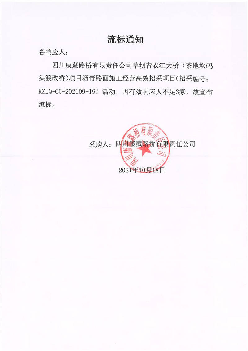 四川康藏路橋有限責(zé)任公司草壩青衣江大橋(茶地坎碼頭渡改橋)項目瀝青路面施工經(jīng)營高效招采項目流標(biāo)通知