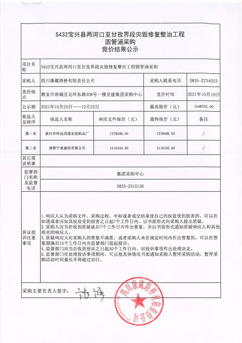 四川康藏路橋有限責(zé)任公司S432線寶興縣兩河口至甘孜界段災(zāi)毀修復(fù)整治工程圓管涵采購競價結(jié)果公示