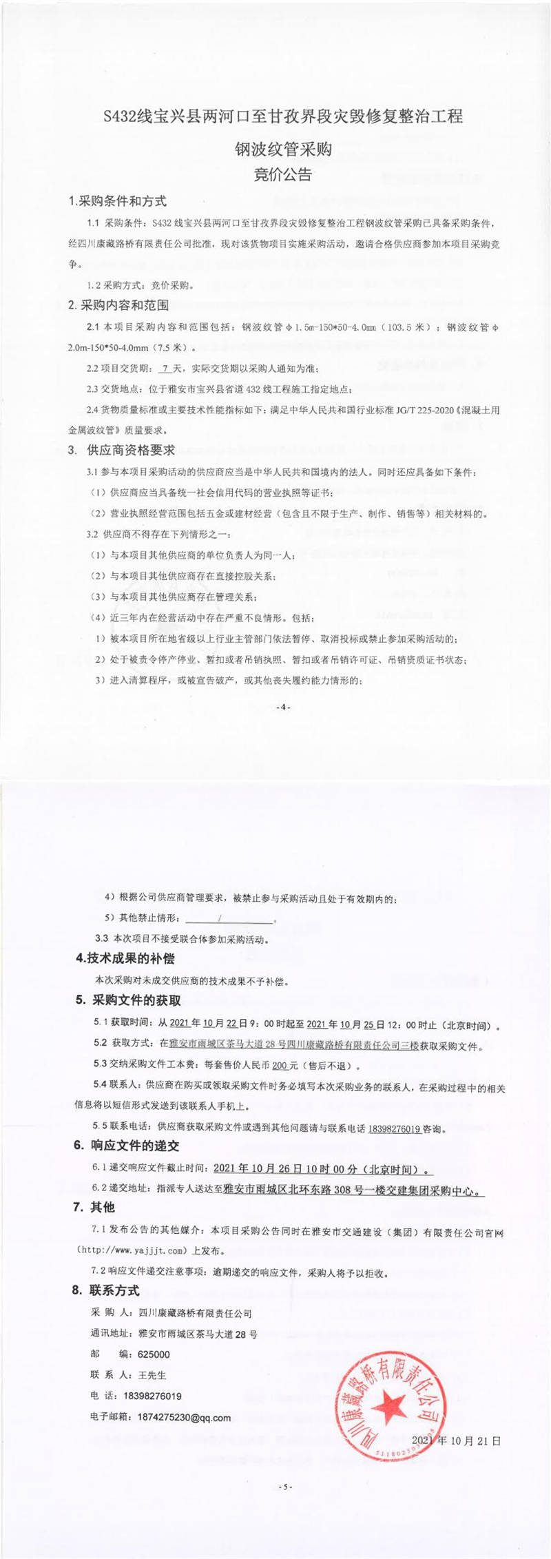 四川康藏路橋有限責(zé)任公司S432線寶興縣兩河口至甘孜界段災(zāi)毀修復(fù)整治工程鋼波紋管采購競價公告