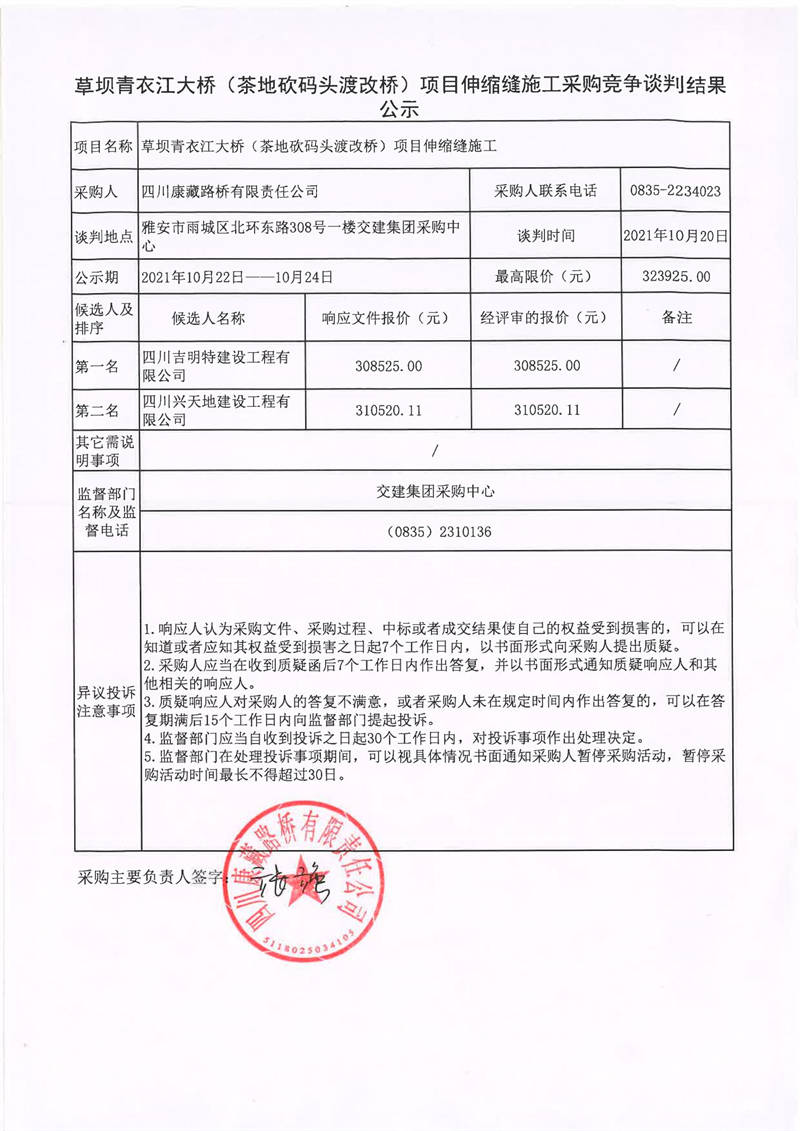 四川康藏路橋有限責(zé)任公司草壩青衣江大橋(茶地坎碼頭渡改橋)項目伸縮縫施工采購競爭談判結(jié)果公示