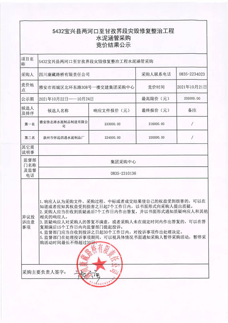 四川康藏路橋有限責(zé)任公司S432線寶興縣兩河口至甘孜界段災(zāi)毀修復(fù)整治工程水泥涵管采購競價結(jié)果公示