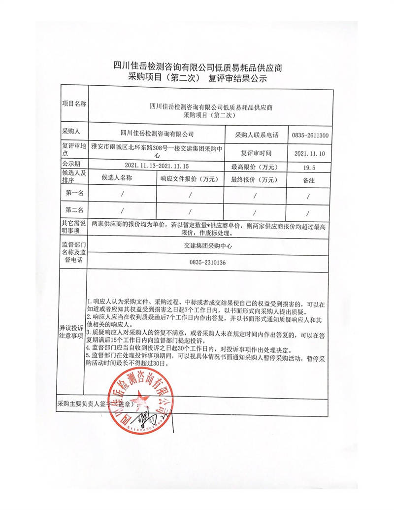 四川佳岳檢測咨詢有限公司低質(zhì)易耗品供應(yīng)商采購項(xiàng)目(第二次)復(fù)評審結(jié)果公示