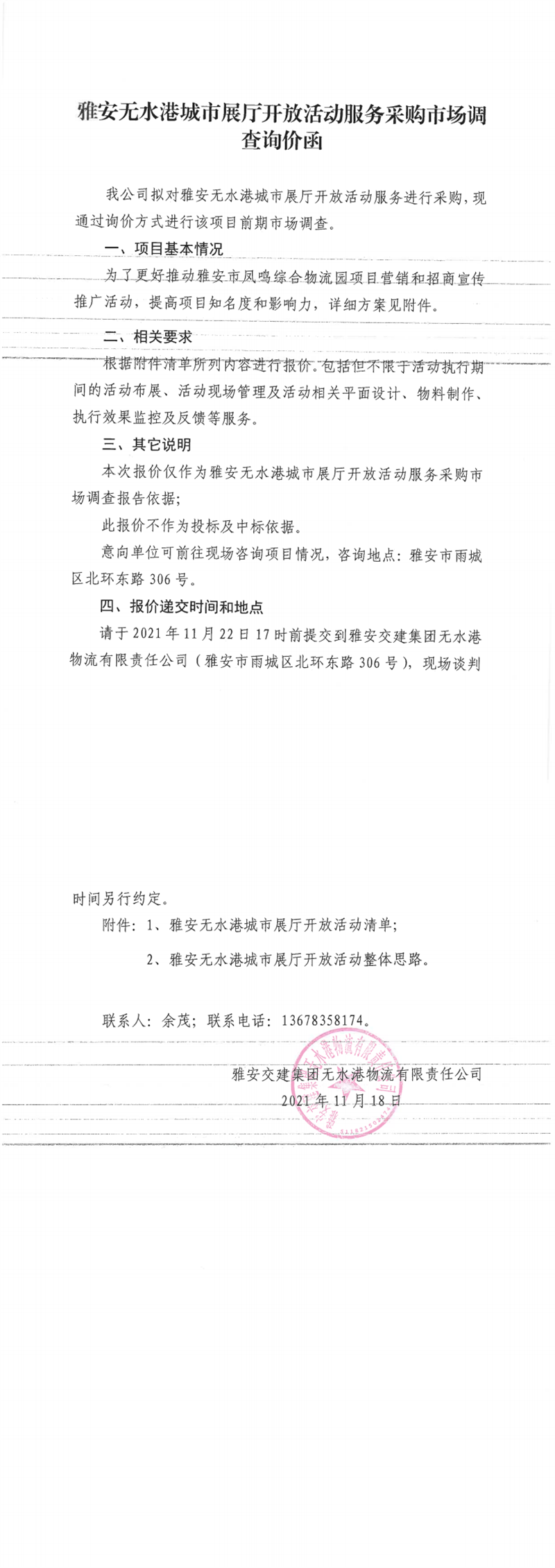 雅安交建集團無水港物流有限責(zé)任公司雅安無水港城市展廳開放活動服務(wù)采購市場調(diào)查詢價函