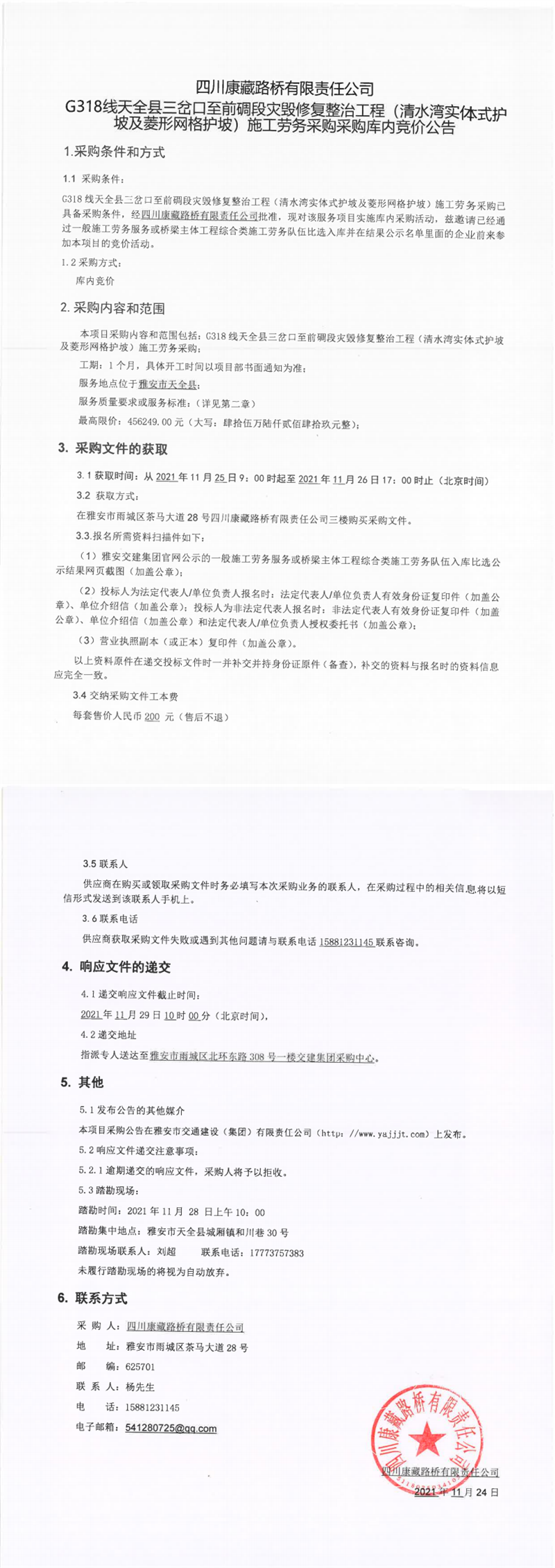 四川康藏路橋有限責(zé)任公司G318線天全縣三岔口至前碉段災(zāi)毀修復(fù)整治工程(清水灣實體式護(hù)坡及菱形網(wǎng)格護(hù)坡)施工勞務(wù)采購采購庫內(nèi)競價公告