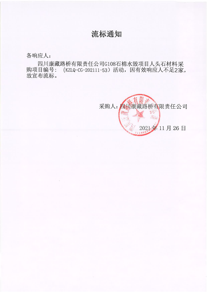 四川康藏路橋有限責(zé)任公司G108石棉水毀項(xiàng)目人頭石材料采購(gòu)流標(biāo)通知