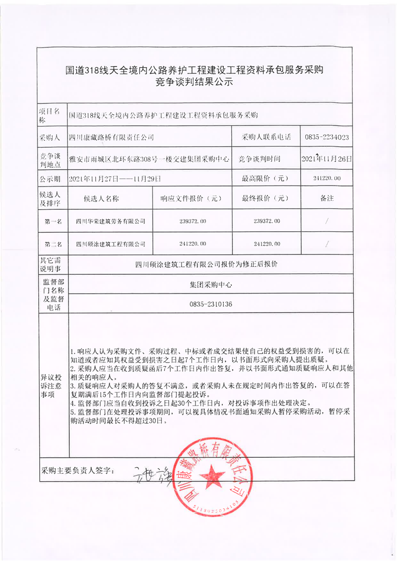 四川康藏路橋有限責(zé)任公司國(guó)道318線天全境內(nèi)公路養(yǎng)護(hù)工程建設(shè)工程資料承包服務(wù)采購競(jìng)爭(zhēng)談判結(jié)果公示
