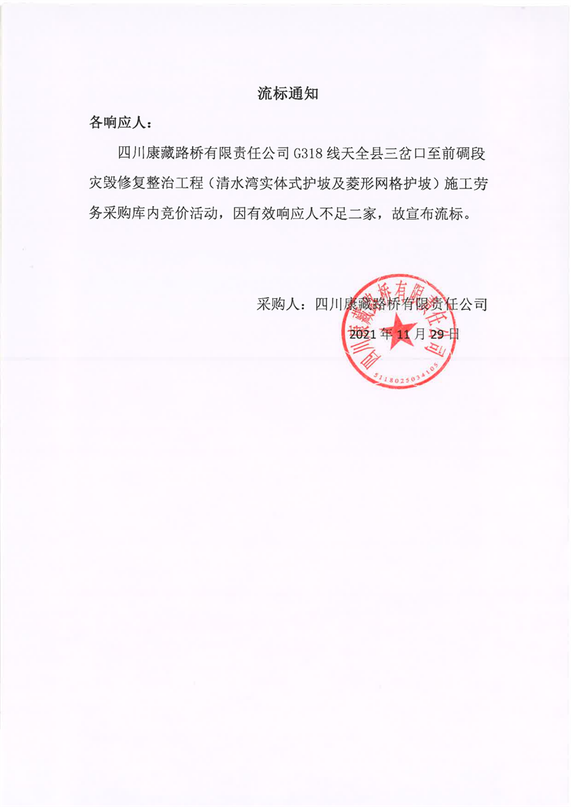 四川康藏路橋有限責(zé)任公司G318線天全縣三岔口至前碉段災(zāi)毀修復(fù)整治工程(清水灣實體式護坡及菱形網(wǎng)格護坡)施工勞務(wù)采購流標(biāo)通知