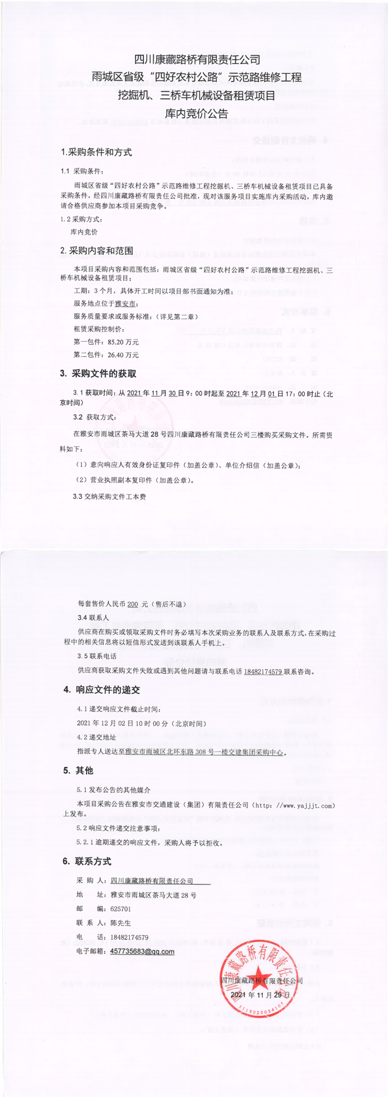 四川康藏路橋有限責(zé)任公司雨城區(qū)省級(jí)“四好農(nóng)村公路”示范路維修工程挖掘機(jī)、三橋車機(jī)械設(shè)備租賃項(xiàng)目庫內(nèi)競價(jià)公告
