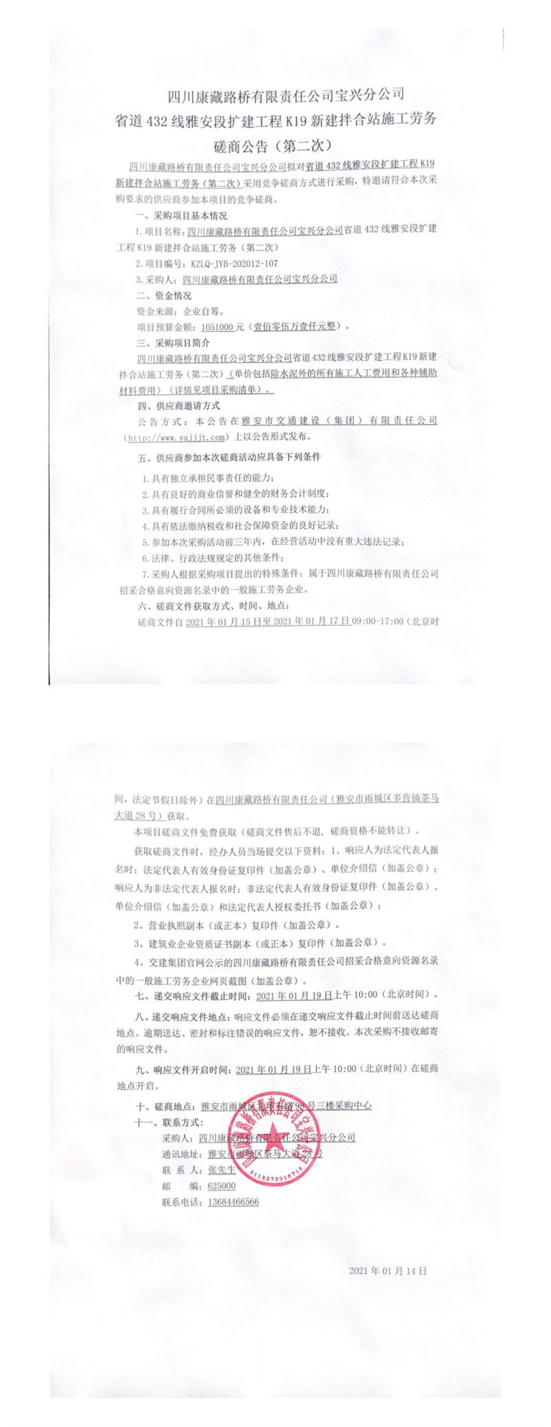 四川康藏路橋有限責(zé)任公司寶興分公司省道432線雅安段擴建工程K19新建拌合站施工勞務(wù)磋商公告(第二次)