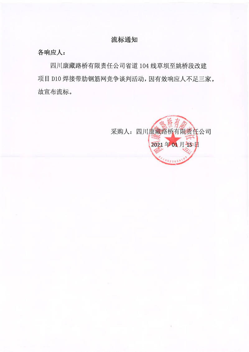 四川康藏路橋有限責(zé)任公司省道104線草壩至姚橋段改建項(xiàng)目D10焊接帶肋鋼筋網(wǎng)采購(gòu)項(xiàng)目流標(biāo)通知
