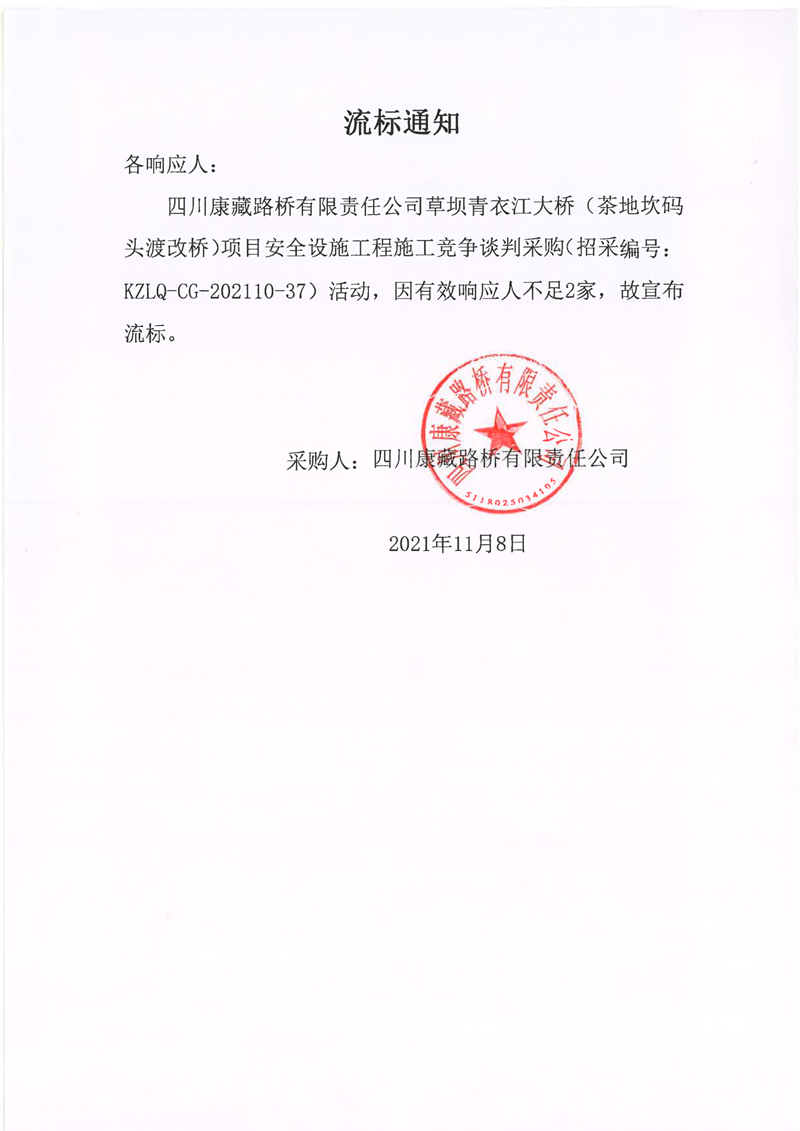 四川康藏路橋有限責(zé)任公司草壩青衣江大橋(茶地坎碼頭渡改橋)項(xiàng)目安全設(shè)施工程施工流標(biāo)通知