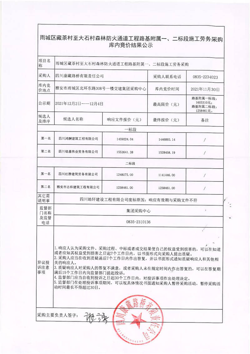 四川康藏路橋有限責任公司雨城區(qū)藏茶村至大石村森林防火通道工程路基附屬一、二標段施工勞務(wù)采購庫內(nèi)競價結(jié)果公示