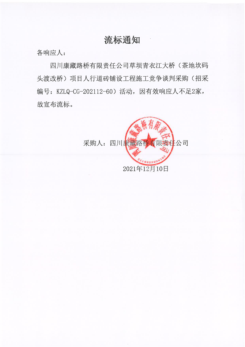 四川康藏路橋有限責(zé)任公司草壩青衣江大橋(茶地坎碼頭渡改橋)項(xiàng)目人行道磚鋪設(shè)工程施工競爭談判采購流標(biāo)通知