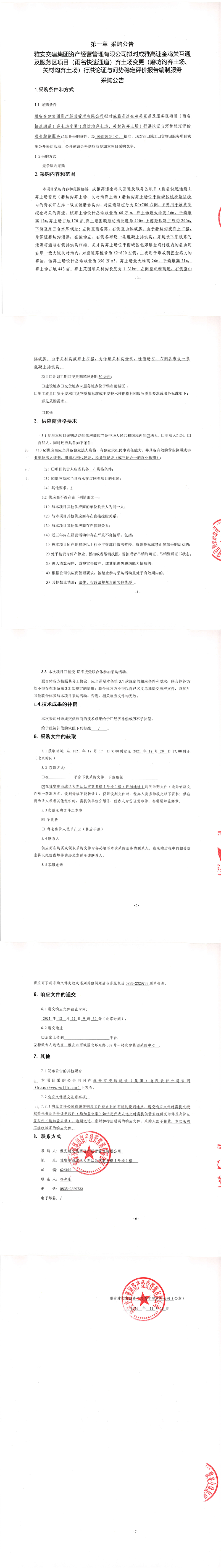 雅安交建集團資產(chǎn)經(jīng)營管理有限公司擬對成雅高速金雞關互通及服務區(qū)項目(雨名快速通道)棄土場變更(磨坊溝棄土場、關材溝棄土場)行洪論證與河勢穩(wěn)定評價報告編制服務采購公告