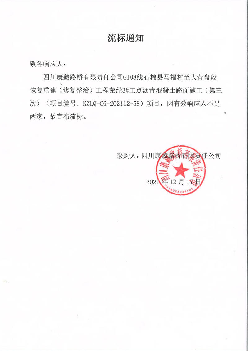 四川康藏路橋有限責(zé)任公司G108線石棉縣馬福村至大營盤段恢復(fù)重建(修復(fù)整治)工程滎經(jīng)3#工點(diǎn)瀝青混凝土路面施工(第三次)流標(biāo)通知