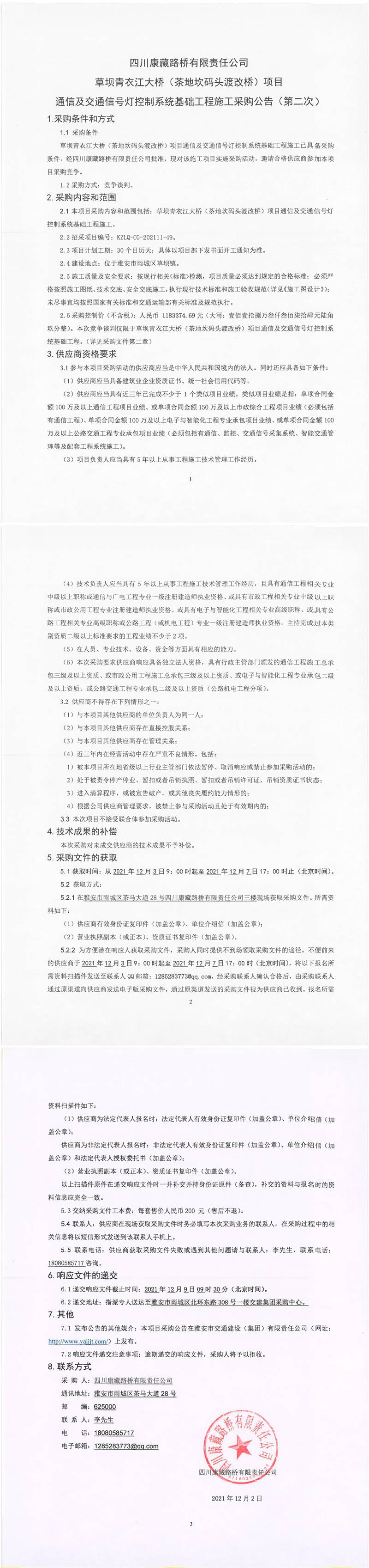 四川康藏路橋有限責任公司草壩青衣江大橋(茶地坎碼頭渡改橋)項目通信及交通信號燈控制系統(tǒng)基礎(chǔ)工程施工采購公告(第二次)