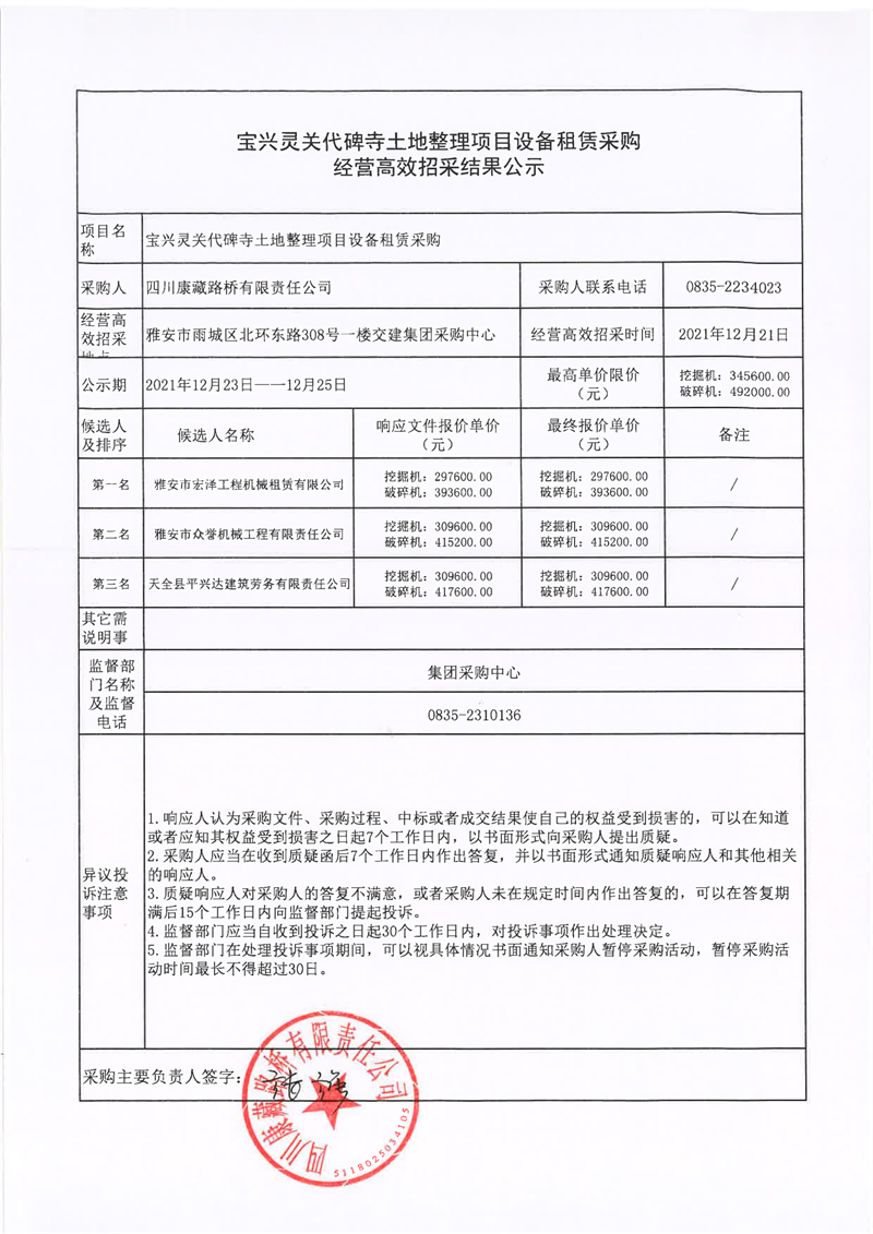 四川康藏路橋有限責任公司寶興靈關代碑寺土地整理項目設備租賃采購經(jīng)營高效招采結果公示