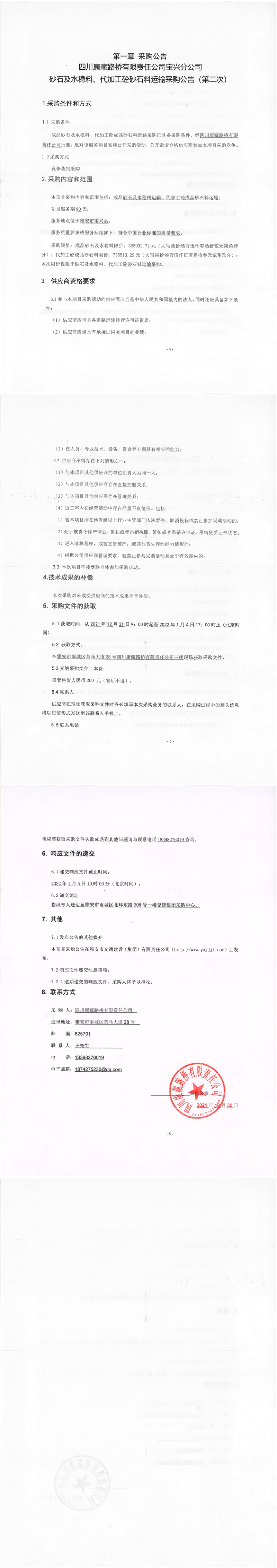 四川康藏路橋有限責任公司寶興分公司砂石及水穩(wěn)料、代加工砼砂石料運輸采購公告(第二次)