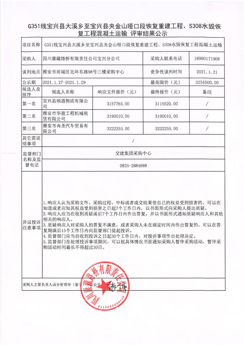 四川康藏路橋有限責任公司寶興分公司G351線寶興縣大溪鄉(xiāng)至寶興縣夾金山啞口段恢復重建工程、S308水毀恢復工程混凝土運輸評審結(jié)果公示