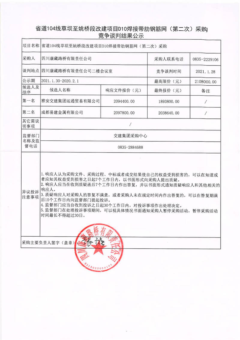 四川康藏路橋有限責(zé)任公司省道104線草壩至姚橋段改建項目D10焊接帶肋鋼筋網(wǎng)(第二次)采購競爭談判結(jié)果公示