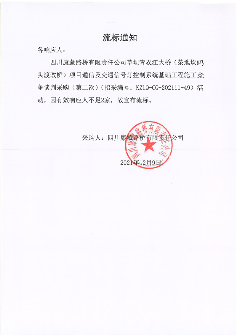 四川康藏路橋有限責(zé)任公司草壩青衣江大橋(茶地坎碼頭渡改橋)項(xiàng)目通信及交通信號(hào)燈控制系統(tǒng)基礎(chǔ)工程施工競(jìng)爭(zhēng)談判采購(第二次)流標(biāo)通知