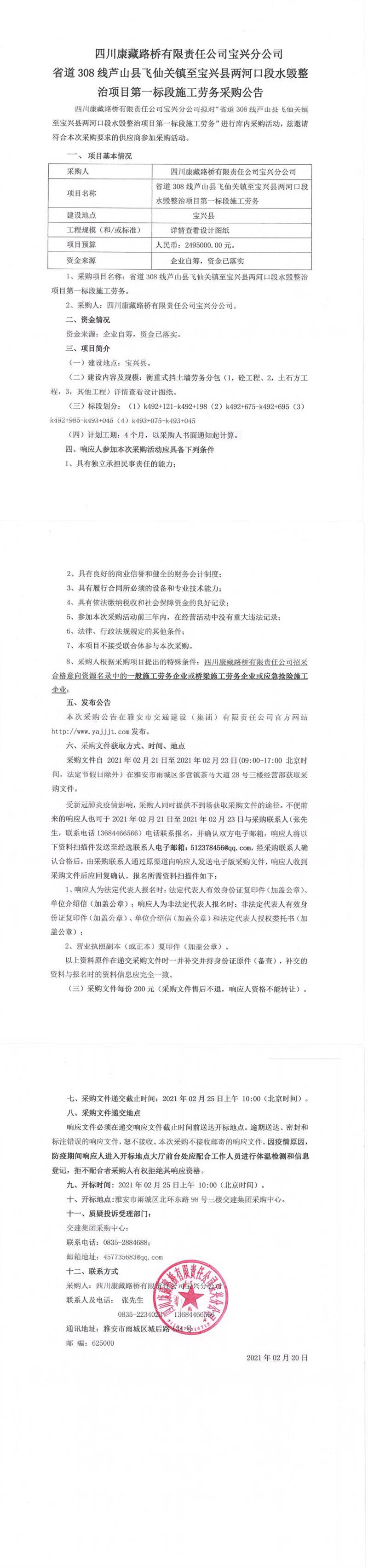 四川康藏路橋有限責任公司寶興分公司省道308線蘆山縣飛仙關鎮(zhèn)至寶興縣兩河口段水毀整治項目第一標段施工勞務采購公告