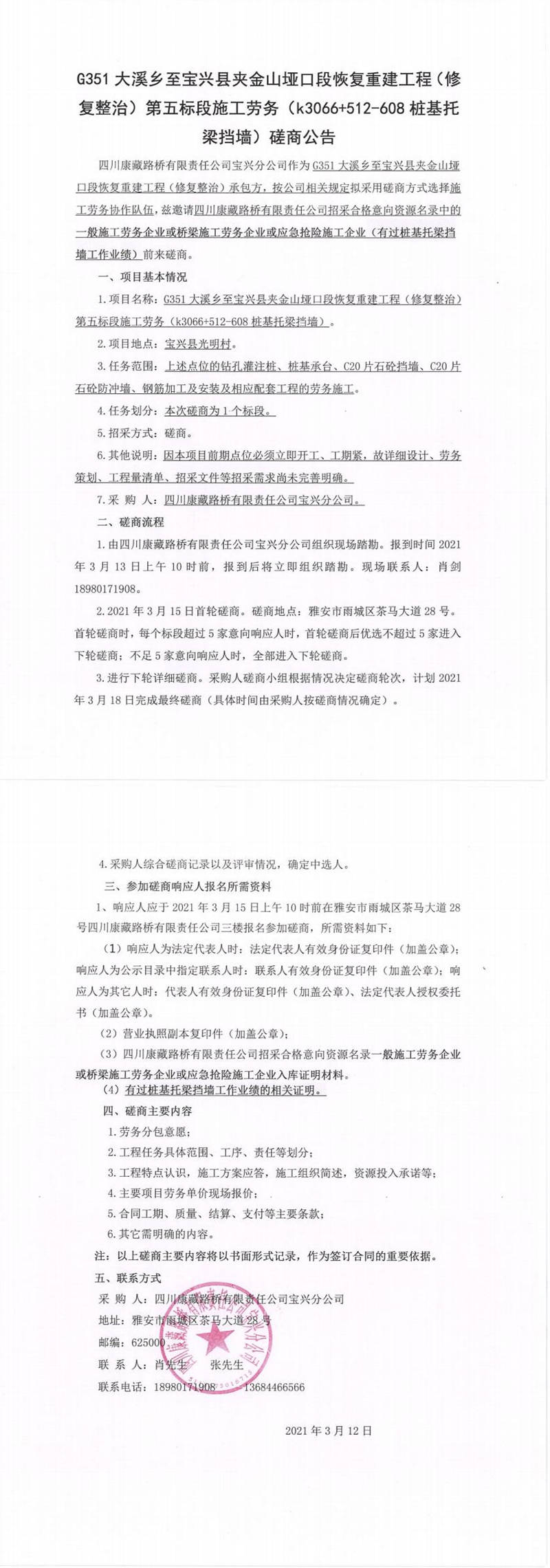 四川康藏路橋有限責(zé)任公司寶興分公司G351大溪鄉(xiāng)至寶興縣夾金山埡口段恢復(fù)重建工程(修復(fù)整治)第五標段施工勞務(wù)(k3066+512-608樁基托梁擋墻)磋商公告