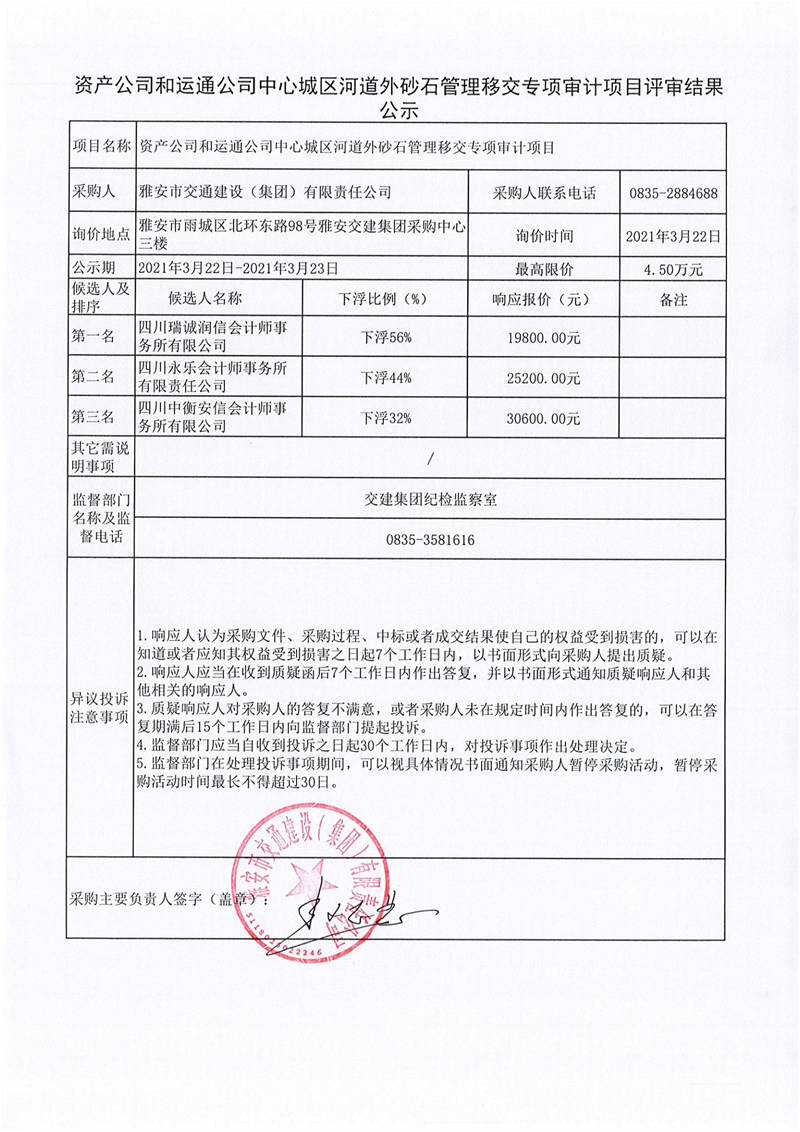 雅安市交通建設(shè)(集團(tuán))有限責(zé)任公司資產(chǎn)公司和運(yùn)通公司中心城區(qū)河道外砂石管理移交專項(xiàng)審計(jì)項(xiàng)目評(píng)審結(jié)果公示