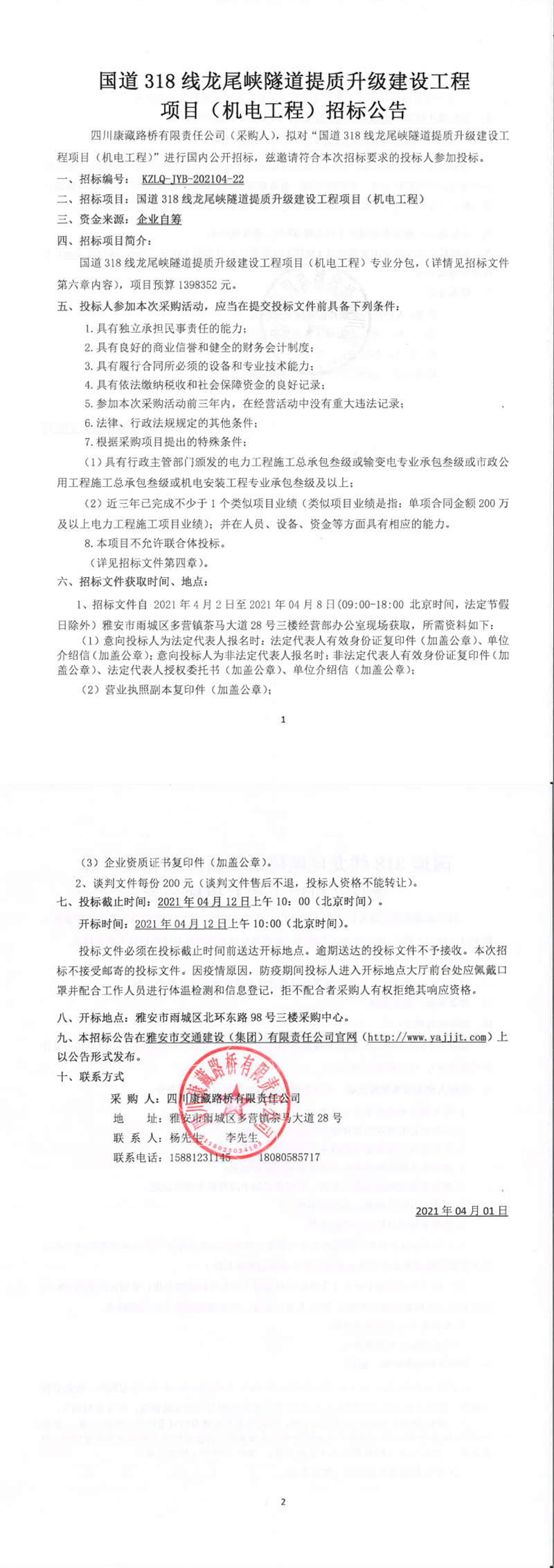四川康藏路橋有限責(zé)任公司國(guó)道318線(xiàn)龍尾峽隧道提質(zhì)升級(jí)建設(shè)工程項(xiàng)目(機(jī)電工程)招標(biāo)公告