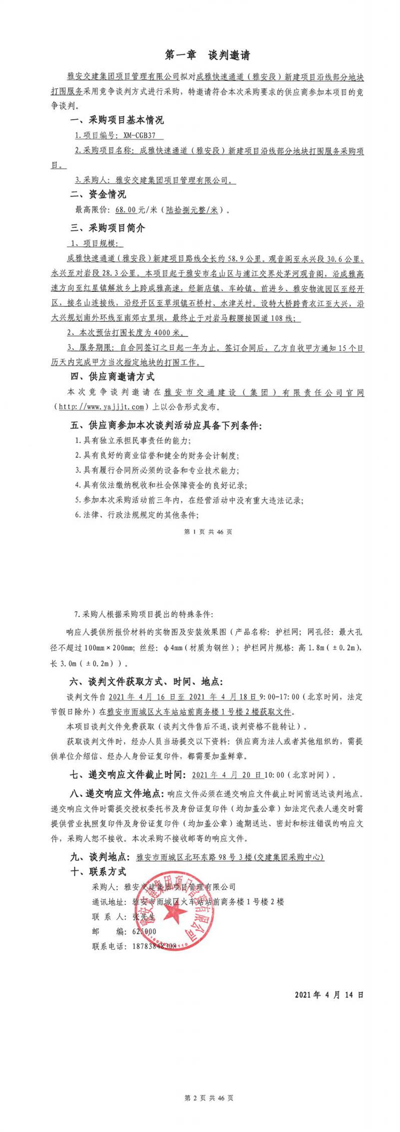 雅安交建集團(tuán)項(xiàng)目管理有限公司成雅快速通道(雅安段)新建項(xiàng)目沿線部分地塊打圍服務(wù)采購項(xiàng)目競爭談判公告