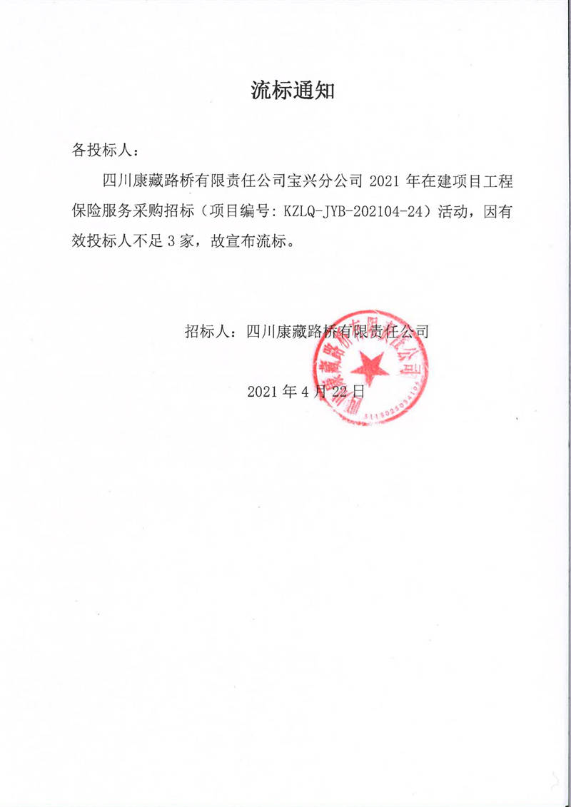 四川康藏路橋有限責(zé)任公司寶興分公司2021年在建項(xiàng)目工程保險(xiǎn)服務(wù)采購(gòu)流標(biāo)通知