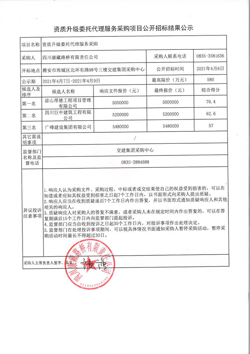 四川康藏路橋有限責(zé)任公司資質(zhì)升級委托代理服務(wù)采購項目公開招標(biāo)結(jié)果公示