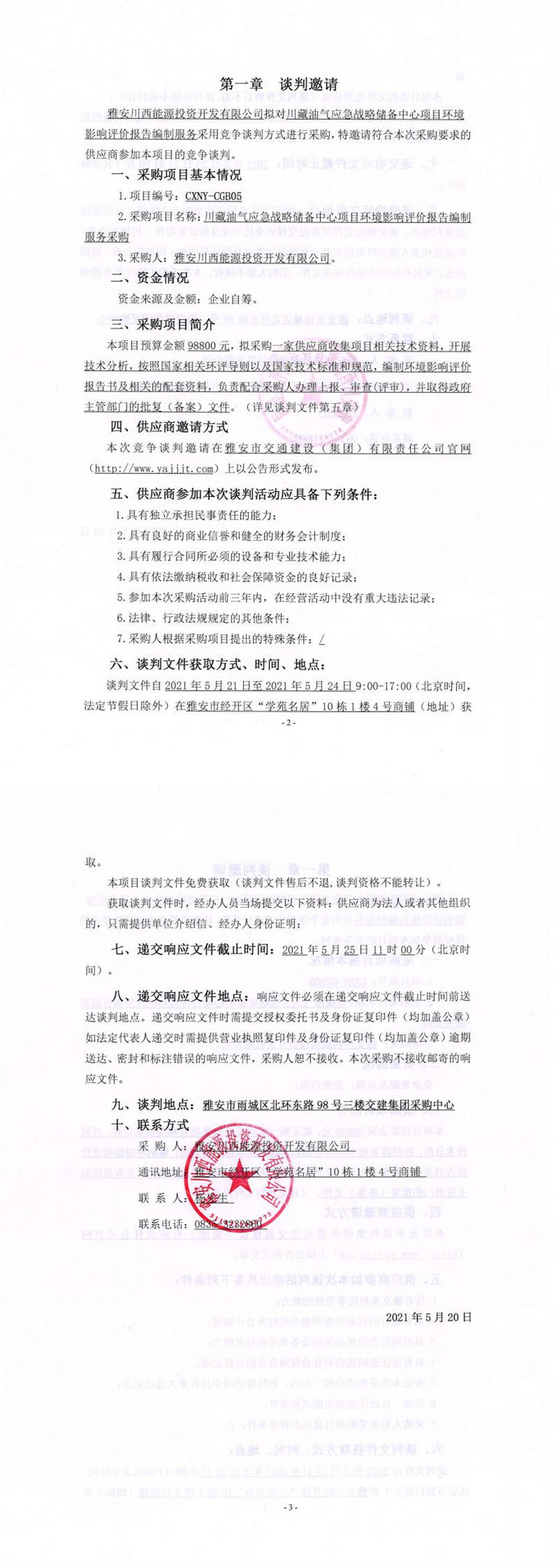雅安川西能源投資開發(fā)有限公司川藏油氣應(yīng)急戰(zhàn)略儲(chǔ)備中心項(xiàng)目環(huán)境影響評(píng)價(jià)報(bào)告編制服務(wù)采購(gòu)競(jìng)爭(zhēng)談判公告