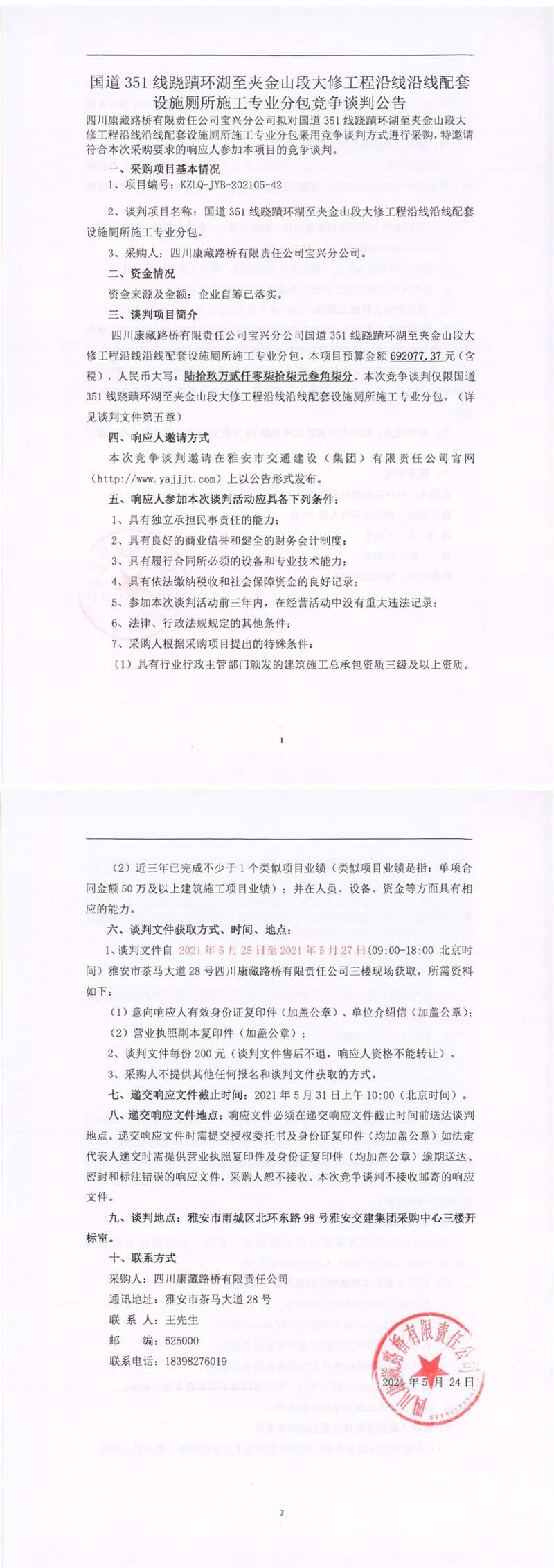 四川康藏路橋有限責(zé)任公司寶興分公司國(guó)道351線(xiàn)蹺磧環(huán)湖至夾金山段大修工程沿線(xiàn)沿線(xiàn)配套設(shè)施廁所施工專(zhuān)業(yè)分包競(jìng)爭(zhēng)談判公告