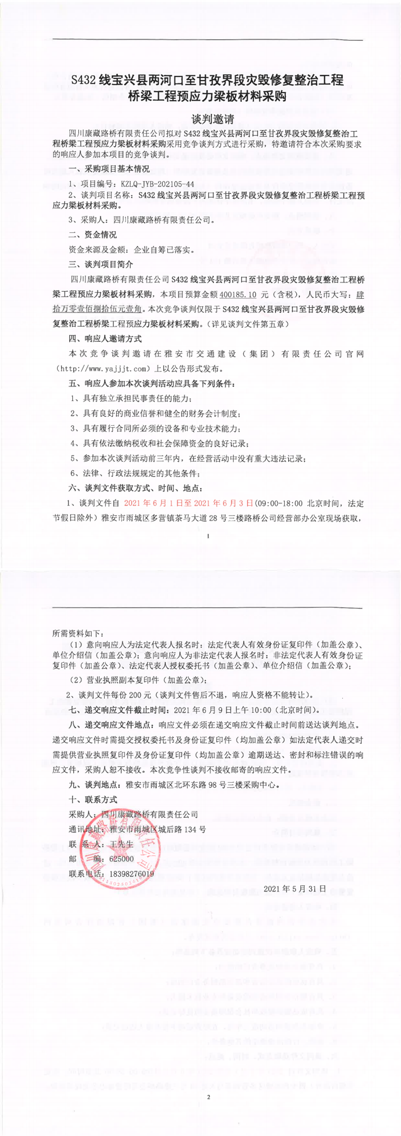 四川康藏路橋有限責(zé)任公司S432線寶興縣兩河口至甘孜界段災(zāi)毀修復(fù)整治工程橋梁工程預(yù)應(yīng)力梁板材料采購(gòu)競(jìng)爭(zhēng)談判公告