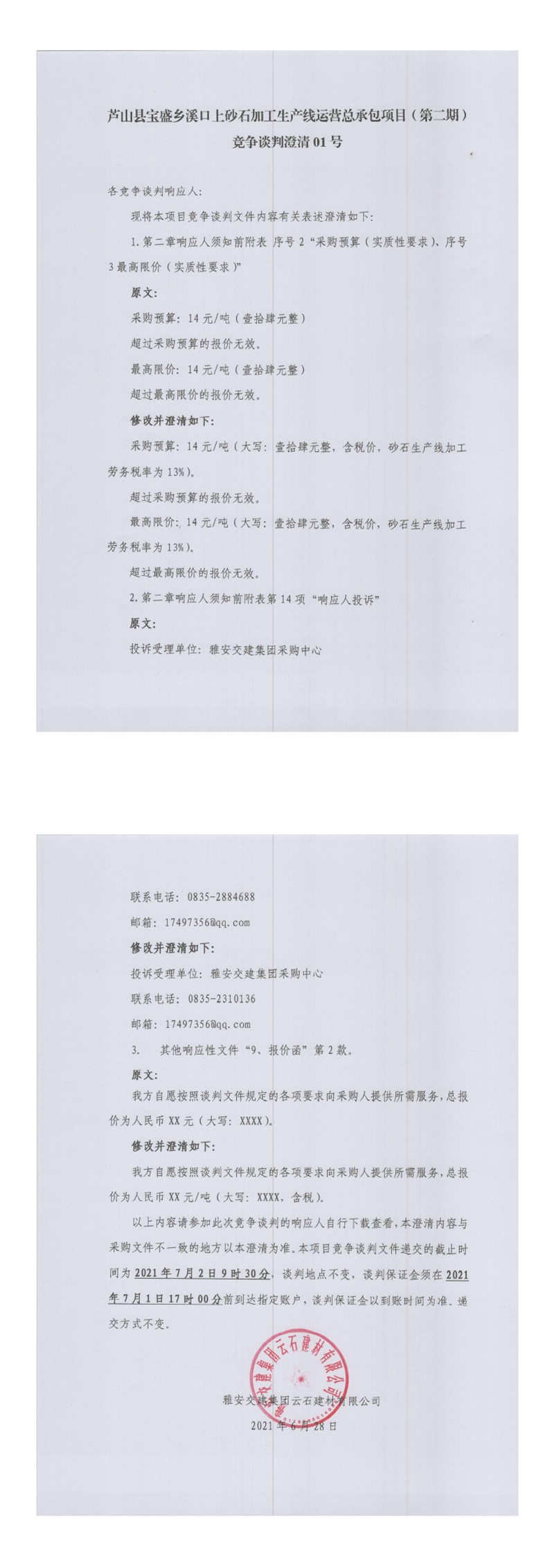 雅安交建集團(tuán)云石建材有限公司蘆山縣寶盛鄉(xiāng)溪口上砂石加工生產(chǎn)線運(yùn)營(yíng)總承包項(xiàng)目(第二期)競(jìng)爭(zhēng)談判澄清公告