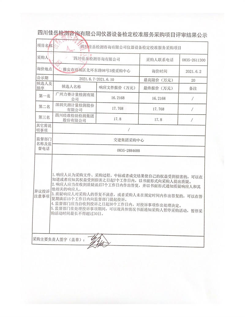 四川佳岳檢測咨詢有限公司儀器設(shè)備檢定校準(zhǔn)服務(wù)采購項(xiàng)目評審結(jié)果公示
