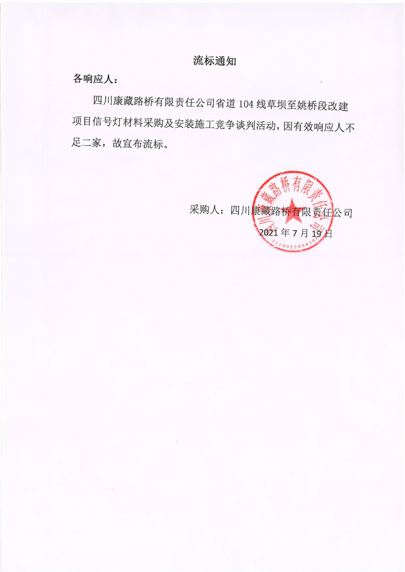 四川康藏路橋有限責(zé)任公司省道104線草壩至姚橋段改建項(xiàng)目信號(hào)燈材料采購及安裝施工競(jìng)爭(zhēng)談判流標(biāo)通知