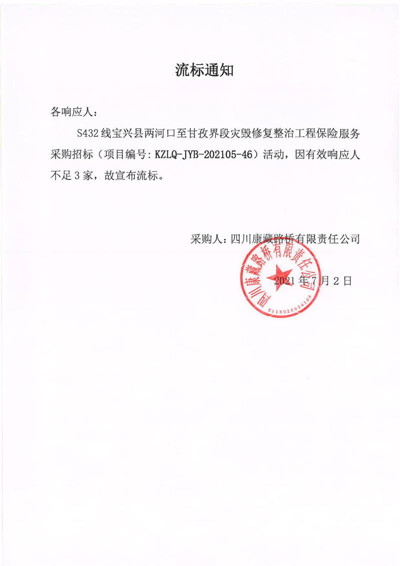 四川康藏路橋有限責任公司S432線寶興縣兩河口至甘孜界段災毀修復整治工程保險服務(wù)采購流標通知