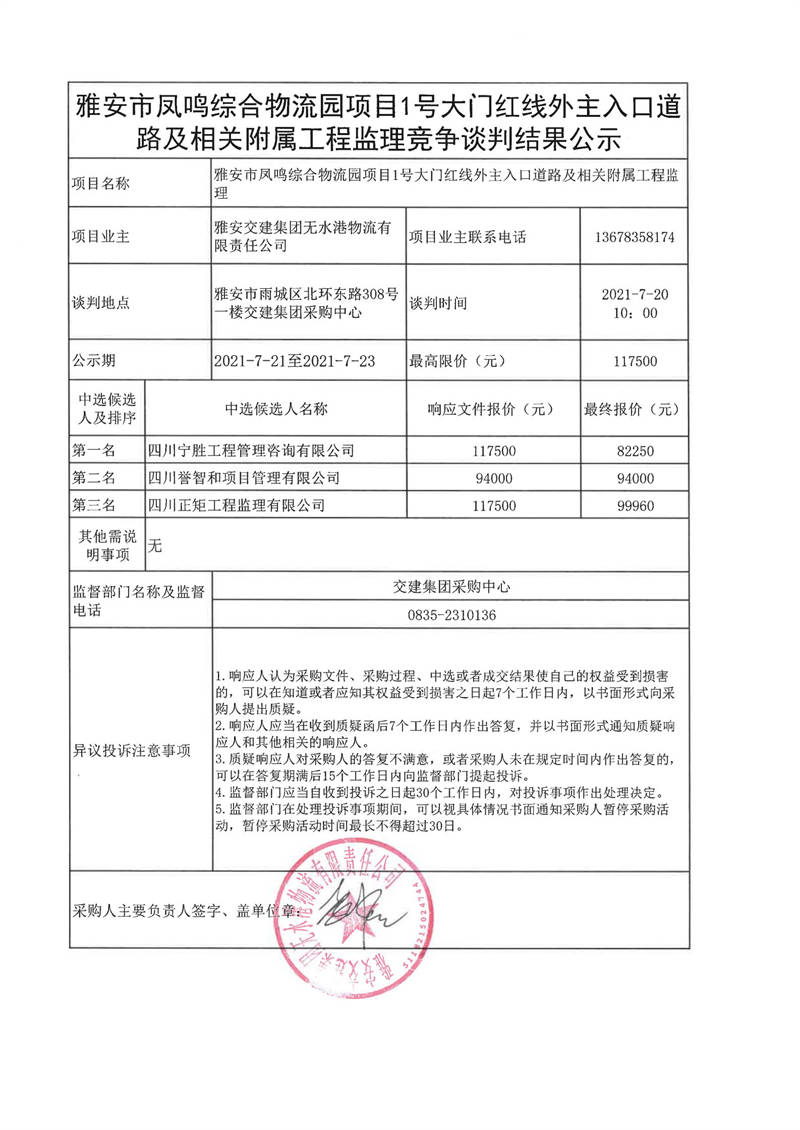雅安交建集團無水港物流有限責(zé)任公司雅安市鳳鳴綜合物流園項目1號大門紅線外主入口道路及相關(guān)附屬工程監(jiān)理競爭談判結(jié)果公示