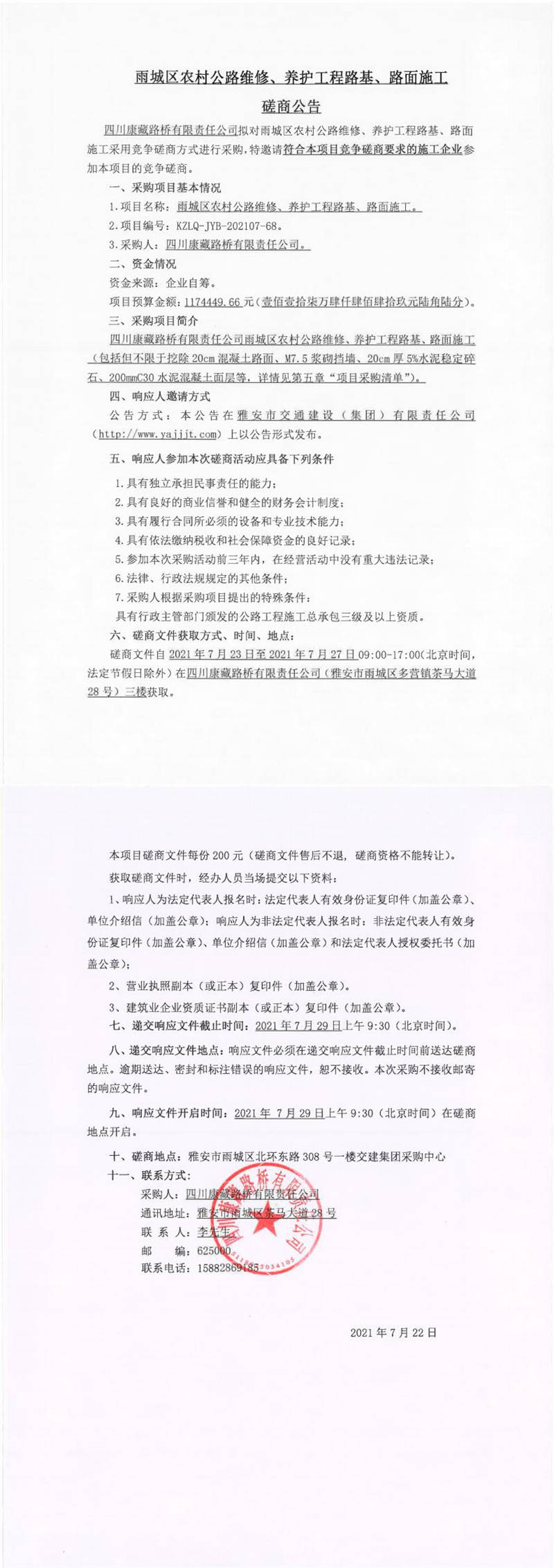 四川康藏路橋有限責任公司雨城區(qū)農(nóng)村公路維修、養(yǎng)護工程路基、路面施工磋商公告